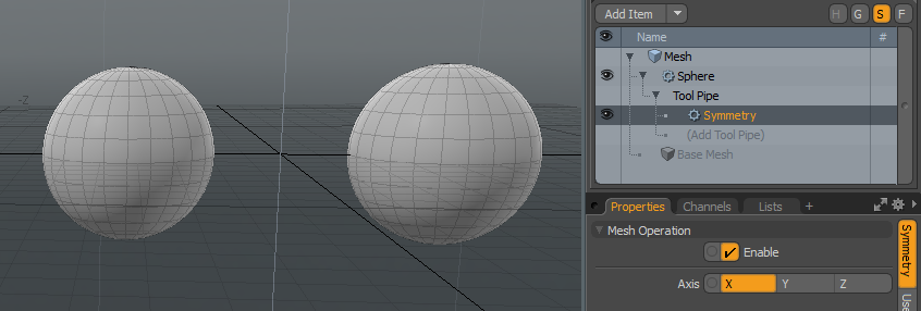 An example of the Symmetry tool with a procedural Primitive can be seen below. A single sphere has been added to the list, and a Symmetry tool has been added to the sphere's tool pipe. The Axis property is set to X. A translation of the sphere along X shows how the sphere is being mirrored in the YZ plane.