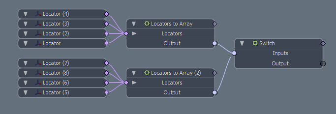 | 2. | Connect the inputs to the node's Inputs channel. In this case, we use two arrays generated from locators using the Array Modifiers modifier. |