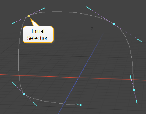 Subsequent clicking and dragging draws additional control points and handles with a curve segment between each control point. Control points are always created at the intersection of the work plane and the mouse button click. The curvature of the segments between control points is defined by the Bezier handles, which are called endpoint tangent vectors.