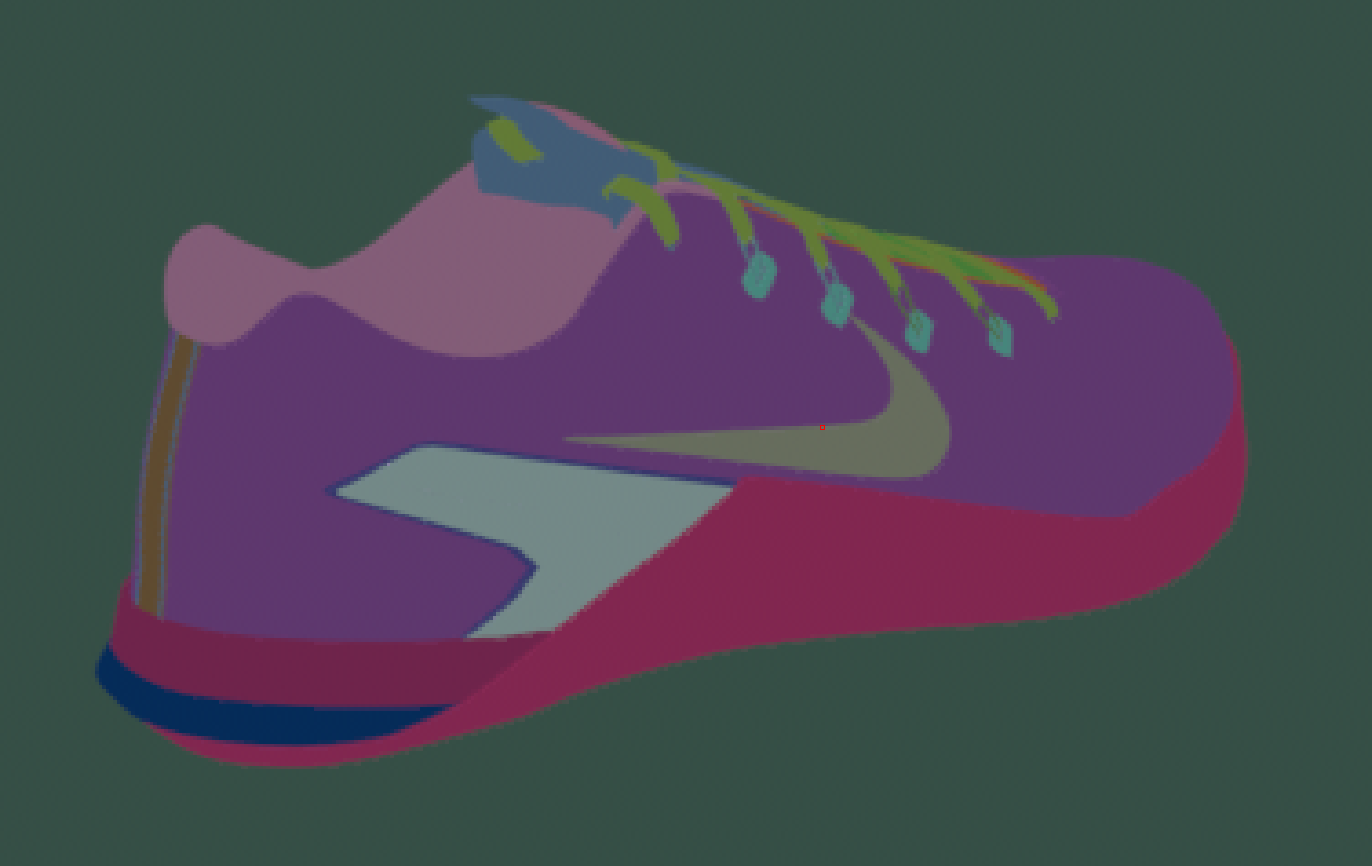 An .exr Cryptomatte file rendered in Modo and imported to Nuke using the Nuke Cryptomatte plug-in. Each matte surface identified in the render is assigned a different color.