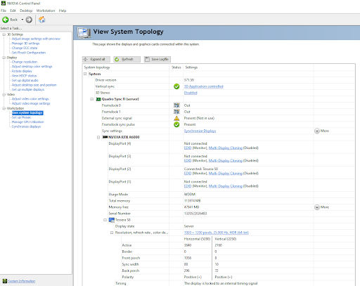 • NVIDIA sync settings in Windows are correct on each RenderNode according to the NVIDIA documentation. Each should show that the vertical sync is set to 3D Application controlled and the framelock sync pulse is present, as below.