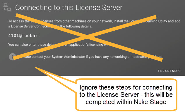 7.   Once you have installed the License server, you can close FLU and continue setting up the License server within Nuke Stage, which is covered in the next section. Note that you can ignore the Connecting to this License Server panel in the FLU.