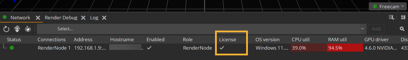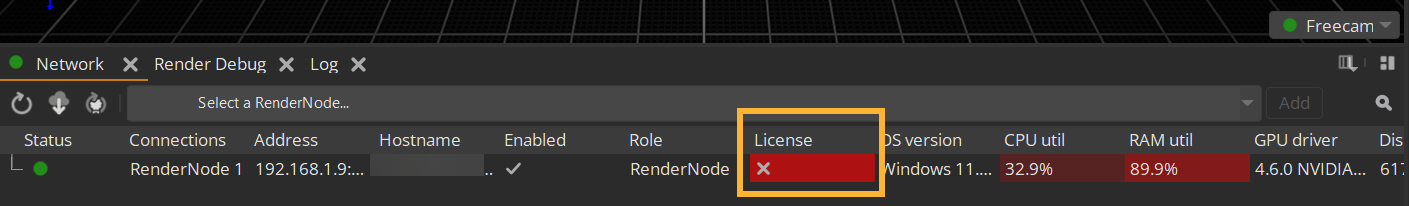 8.   In the Network panel, when first connecting to the RenderNodes, the License column will let you know if the license has been picked up successfully: