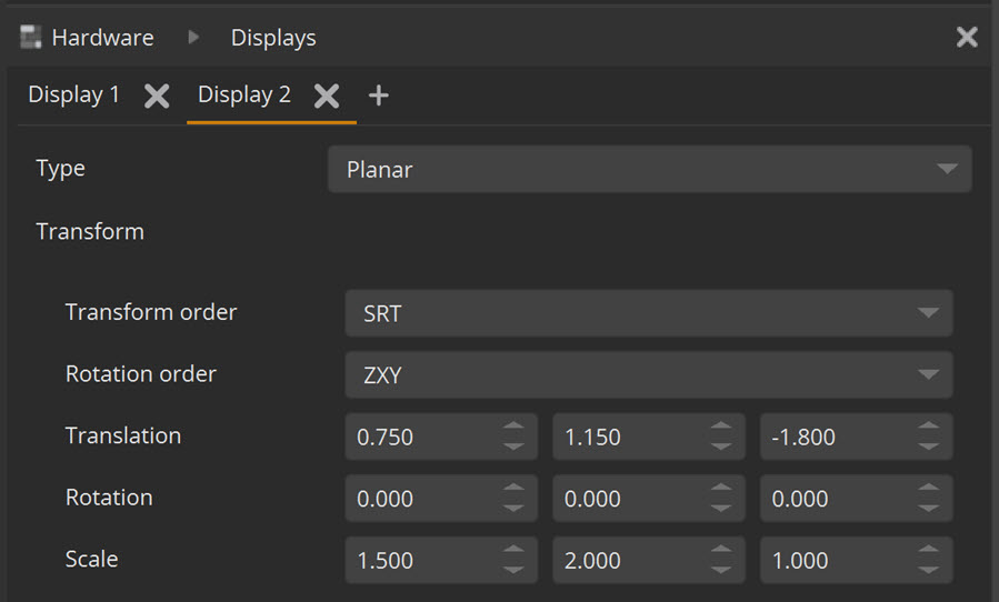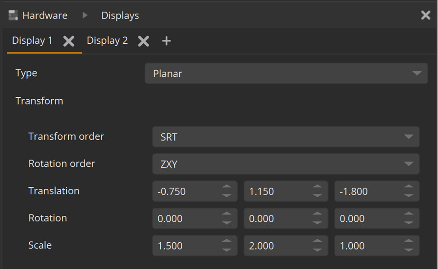 | 1. | In Project Graph > Hardware > Displays, add two displays and match their dimension and position in reality using the Transform property. This ensures they will align with the tracking system. |