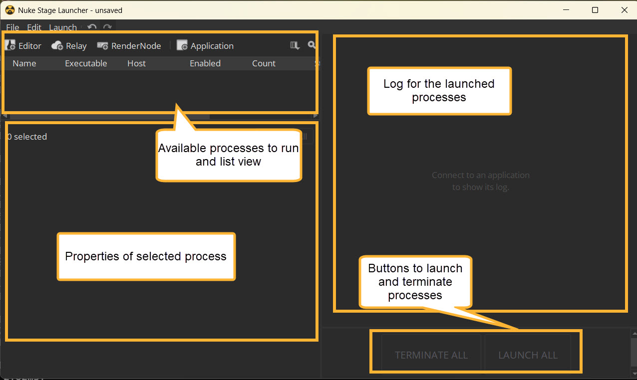 • NukeStage Launcher GUI - The Launcher enables you to define where processes run. It can control the launching of processes across a larger stage.