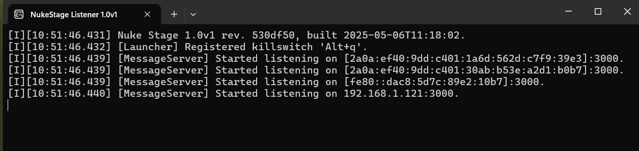 Note: You can install the Listener as a start up service from the installer, so it runs automatically. Find out more at Launching Nuke Stage