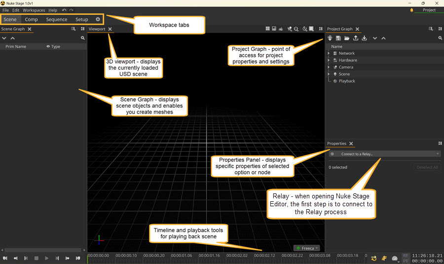 The Nuke Stage Editor is the Nuke Stage UI where you open, edit and play your USD scene.