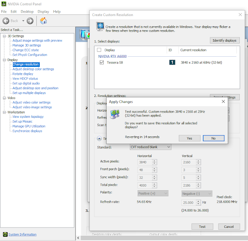 For virtual production workflows with a display processor (e.g., Brompton), proper usage of Extension Display Identification Data (EDID) ensures that all RenderNodes output compatible timing and resolution. This can be set up from the NVIDIA Control Panel > Display > Change Resolution.