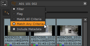 • Match Any Criteria - media that matches any of the entries in the search string are matched. Using the same example, A01 DPX matches any media containing A01 or DPX.