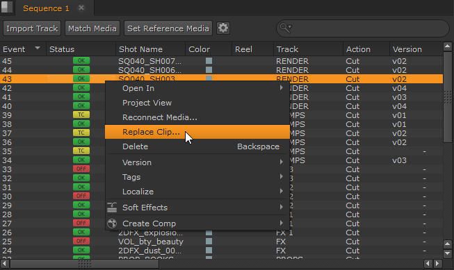 • Replace Clip - replaces the selected entry with a specified source clip. Nuke Studio assumes that any source clip you choose is acceptable, regardless of timecode.