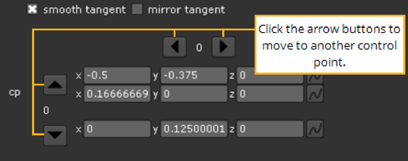 • Increment or decrement the numbered x, y, and z fields. For each control point, the controls for translating the point itself are shown on top of the controls for translating the tangents.