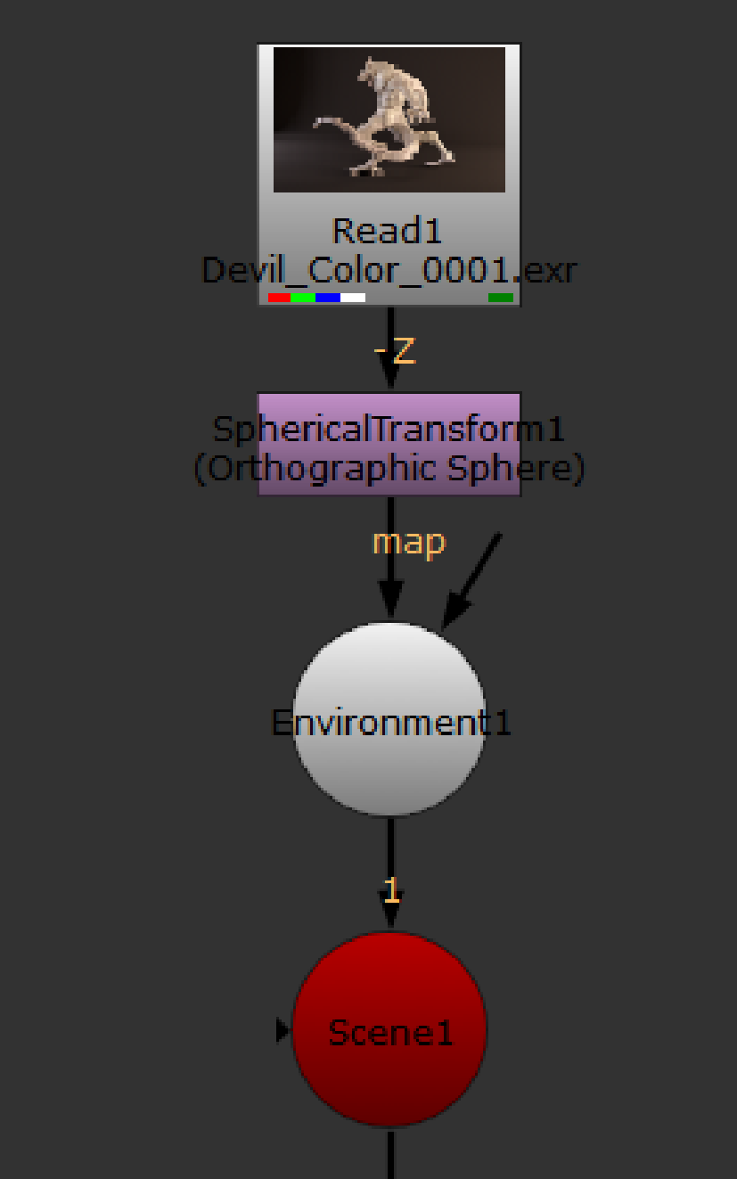 | 3. | Select 3D > Lights > Environment to insert an Environment node in your script. Connect the SphericalTransform node to the Environment node’s map input, and the Environment node to the Scene node. |