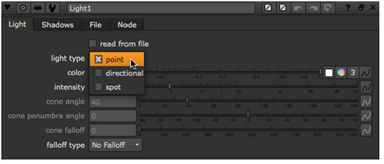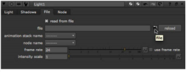| 2. | In the Light controls, check read from file. This enables the controls on the File tab, allowing you to read in lights from an .fbx file. It also disables all controls whose values are filled from the .fbx file. You can still view these values and use them in expressions, but you cannot modify them, because they are read from the .fbx file. Any changes you make in the .fbx file are reflected in these values of the Light node. |