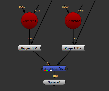 For example, if you wanted to combine two Project3D nodes and composite their results onto a sphere, your node tree would look something like the following: