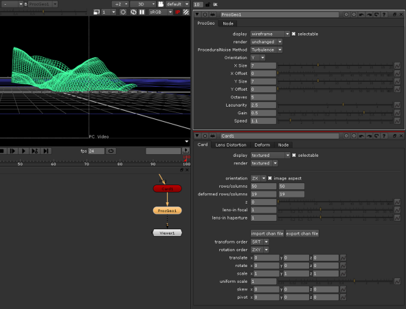 The ProcGeo, or ProceduralNoise, node lets you modify your 3D objects using a Perlin noise function that creates seemingly random noise. For example, you could use the ProcGeo node to generate animated noise for rippling waves or clouds, or to create a terrain from a flat card, like in the following image: