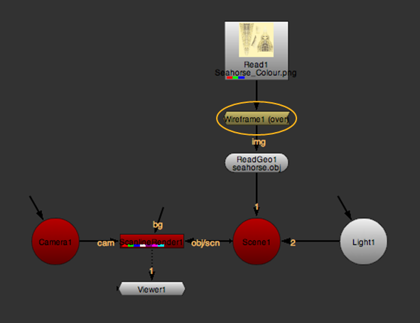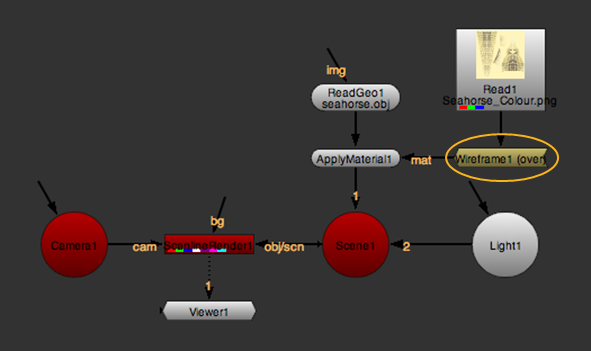 | 2. | Place the Wireframe node between your 2D texture image and your 3D object node, or connect it to an ApplyMaterial node’s mat input. |