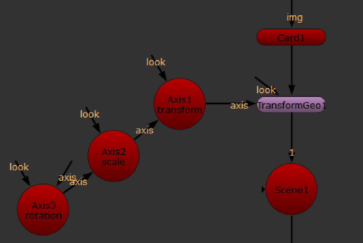 In the above example, Axis3 (rotation) is connected to Axis2 (scale). Axis2 is connected to Axis1 (transform), and Axis1 is connected to the TransformGeo node(s) that you want to affect. With the Axis nodes connected in this manner, their transformation data ripples down the chain and is added to the settings of the TransformGeo node.