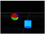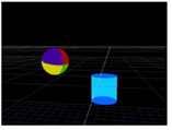 Another use of the TransformGeo node is to have the rotation of one object depend on the position of another so that the first object is always rotated to face or “look at” the second one. For example, you can have a sphere object always facing a cylinder object, regardless of the cylinder’s position. When the cylinder is moved to a new position, the sphere is automatically rotated to face it.