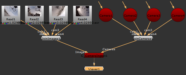 CaraVR connects all your images and cameras to the C_CameraIngest node using JoinViews nodes with modified names, JoinImages and JoinCameras.