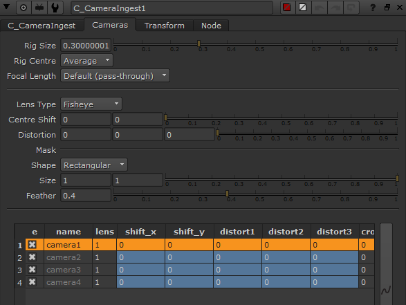 C_CameraIngest takes manually solved or pre-tracked footage from third-party applications and adds CaraVR metadata to the stream to build a model of the relationship between the cameras to pass to the stitcher or as the basis for further refinement with the C_CameraSolver.
