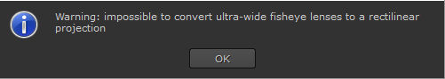 Nuke can't automatically convert extreme fisheye focal lengths to rectilinear. If you attempt to export some fisheye cameras from C_CameraSolver, a warning message is displayed.