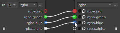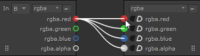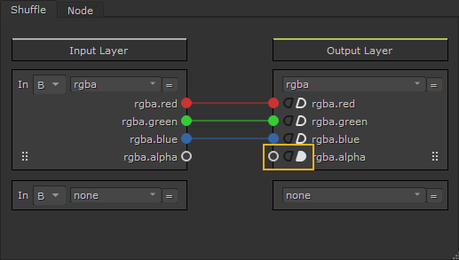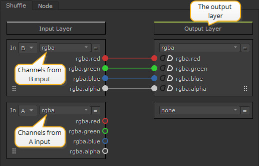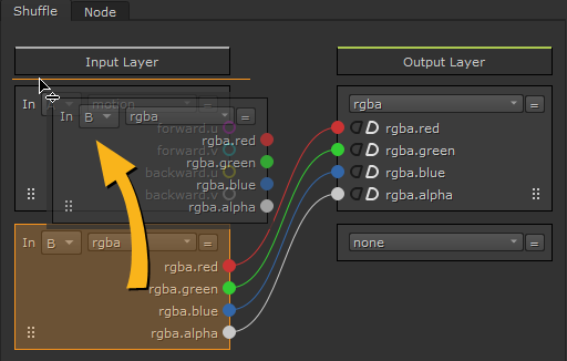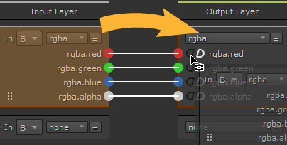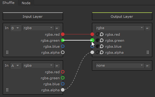 The Input Layer represents the channel sets connected to the B and A inputs and the Output Layer represents what is passed down the node tree. You can drag noodles from sockets in either direction to connect the input and output layers. Nuke displays a preview of the resulting noodle connection in white when you drag sockets.