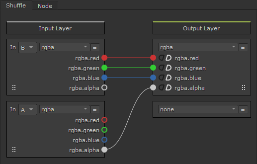 A slightly more complex Shuffle from two images might be replacing the B input's alpha channel with the A input's alpha channel.