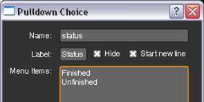 | 3. | Enter status as the Name for the control and Status as the Label. In the Menu Items field, list the items you want to appear in the dropdown menu - in this case, Finished and Unfinished. |