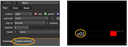 | 4. | On the Group1 Node Graph tab, double-click the Text1 node to open its controls. In the message field, enter the following expression: [value version]. This expression calls the control named version that you created in the previous step. Therefore, whatever is entered in the Version field of the Group node (for example, v03), appears as a result of the Text1 node. |