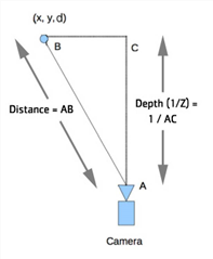 In the figure below, each pixel forms a ray, and AB measures the physical distance from the camera to the 3D point, whereas AC measures the distance along the Z axis for the camera.
