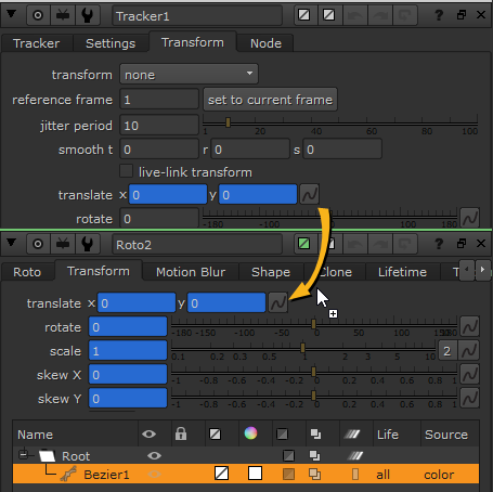 | 6. | Click the Transform tab and Ctrl/Cmd drag the Tracker translate animation control to the corresponding control in the Roto Properties. |