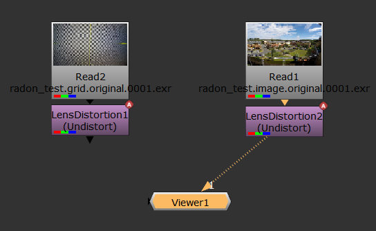 | 2. | Copy and paste the LensDistortion node containing the grid analysis (described in Estimating Lens Distortion Using a Grid), then connect it to the sequence and a Viewer. |