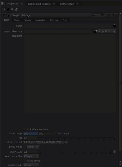 The Root node allows you to control parameters that affect the entire Nuke script, rather than just a single node. You can access the Root node parameters by going to Project Settings and viewing the Root tab.