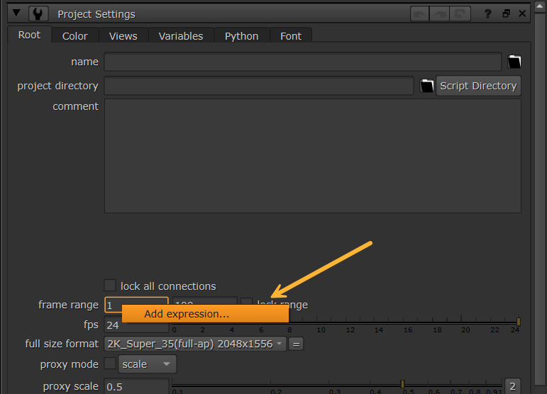 The frame range (first_frame and last_frame) and fps knobs on the Root node allow expressions, allowing you to reference Variables here.
