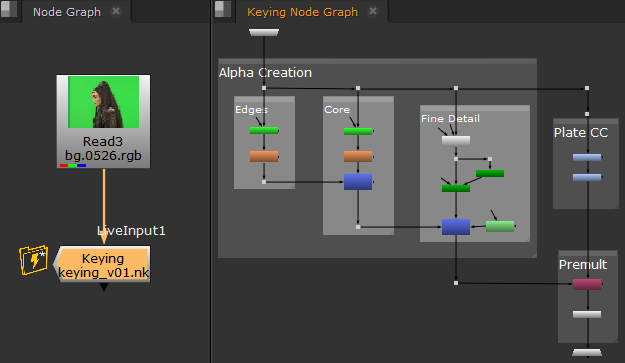 The LiveGroup node is different to Precomps and Groups in that it allows multiple artists to work on the same script at the same time, drawing work from disparate scripts into the source script. A simple example is shown below, where the Keying, CameraTrack, and VFX LiveGroups contain the node trees for those operations in separate scripts.