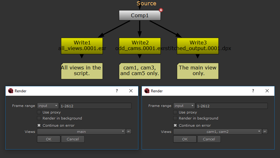 For example, if your script contained two Write nodes calling for the main view and left and right views, but the Render dialog is set to render main, then only the main view is rendered.