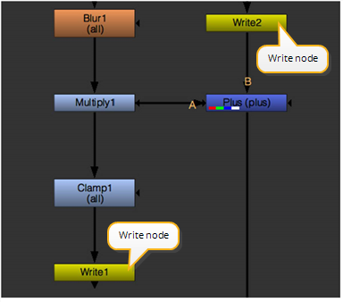 One Write node is usually placed at the bottom of the compositing tree to render the final output. However, Write nodes have both input and output connectors, so they may be embedded anywhere in the compositing tree.