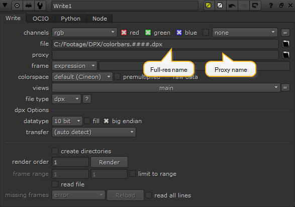 • check read file if you want the output of the Write node to be produced by reading the rendered file back in rather than by processing the upstream node tree. For more information on this and the missing frames control, see Using a Write Node to Read in the Rendered Image.