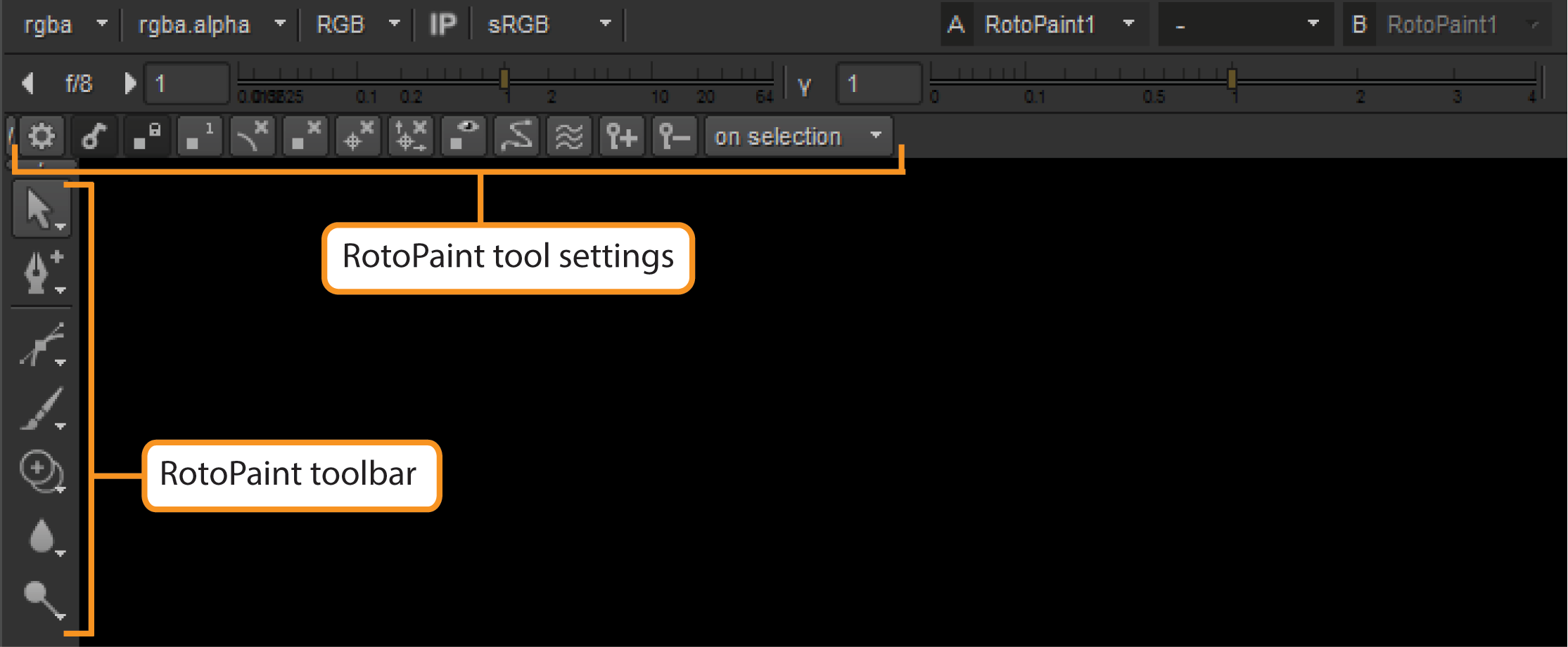 In the RotoPaint node, you can use two toolbars to define the type of stroke/shape you want to start drawing. These toolbars are placed in the Viewer. The vertical RotoPaint toolbar is for selecting the tool you want to use and the horizontal one, RotoPaint tool settings, is for adjusting the currently selected tool’s settings before drawing new strokes/shapes.
