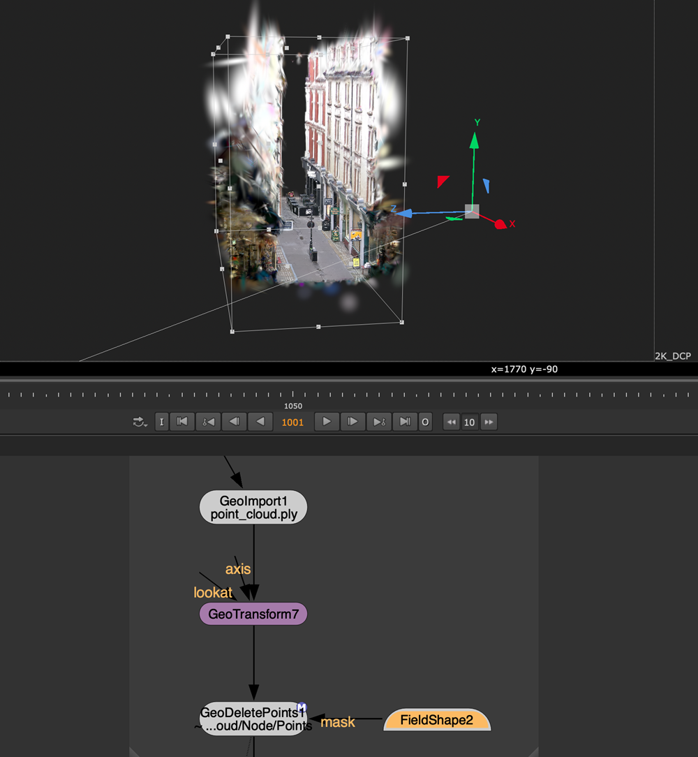 | 3. | This can then be done a second time, using another FieldShape to create a mask for another GeoDeletePoints node. This time the FieldShape targets the specific object to remove in the mask - in this case, the bin in the scene. |