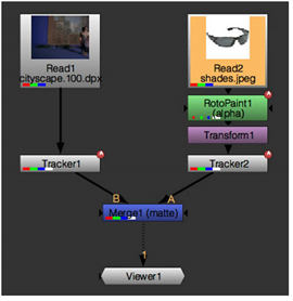 Nuke applies the tracked movement to the footage you want to match-move. A simple script might appear as follows, where Tracker2 is a copy of Tracker1: