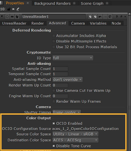 In Nuke’s UnrealReader node under Advanced tab > Color Output section there are options, outlined below, which match those in the standard Movie Render Queue config section for OCIO.