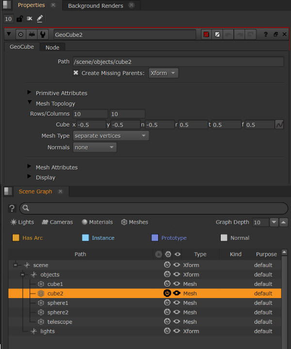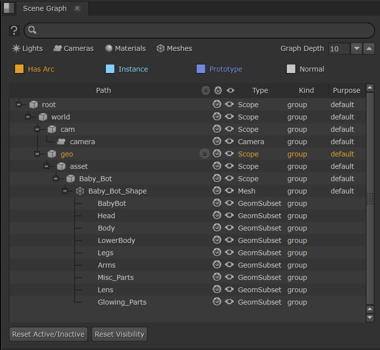 The Scene Graph has styling to help you visualize the hierarchy of your stage. Prims with Arcs, Instances and Protypes appear in different colors: