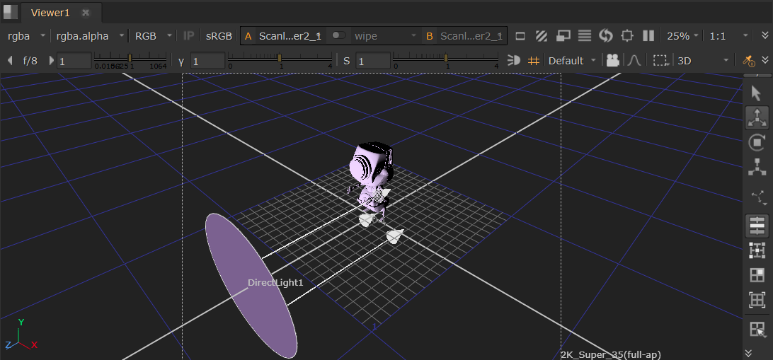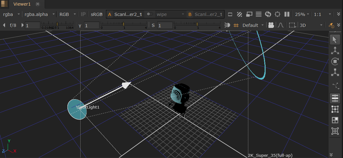 • The scene is then connected to a ScanlineRender node and the Viewer in order to view it. The Position tab includes Constrain and Xform options, and the Display tab allows you to change how the lights look in the Viewer. You can then use the transformation handles to transform the lights interactively in the Viewer. See more about how you can use the Viewer at Lights in the Viewer.
