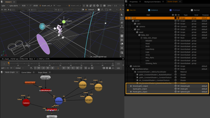 • In this example, we have added three of the Nuke lights: DirectLight, PointLight and SpotLight. (We have also changed the Color of each of them in the Node Properties).