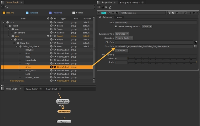 A GeoReference node is added to the Node Graph and its Properties are displayed. In this simple example, the GeoReference node is immediately downstream of the original GeoImport containing the prim we're going to reference. In reality the GeoReference node can be anywhere downstream of the prim it's referencing.