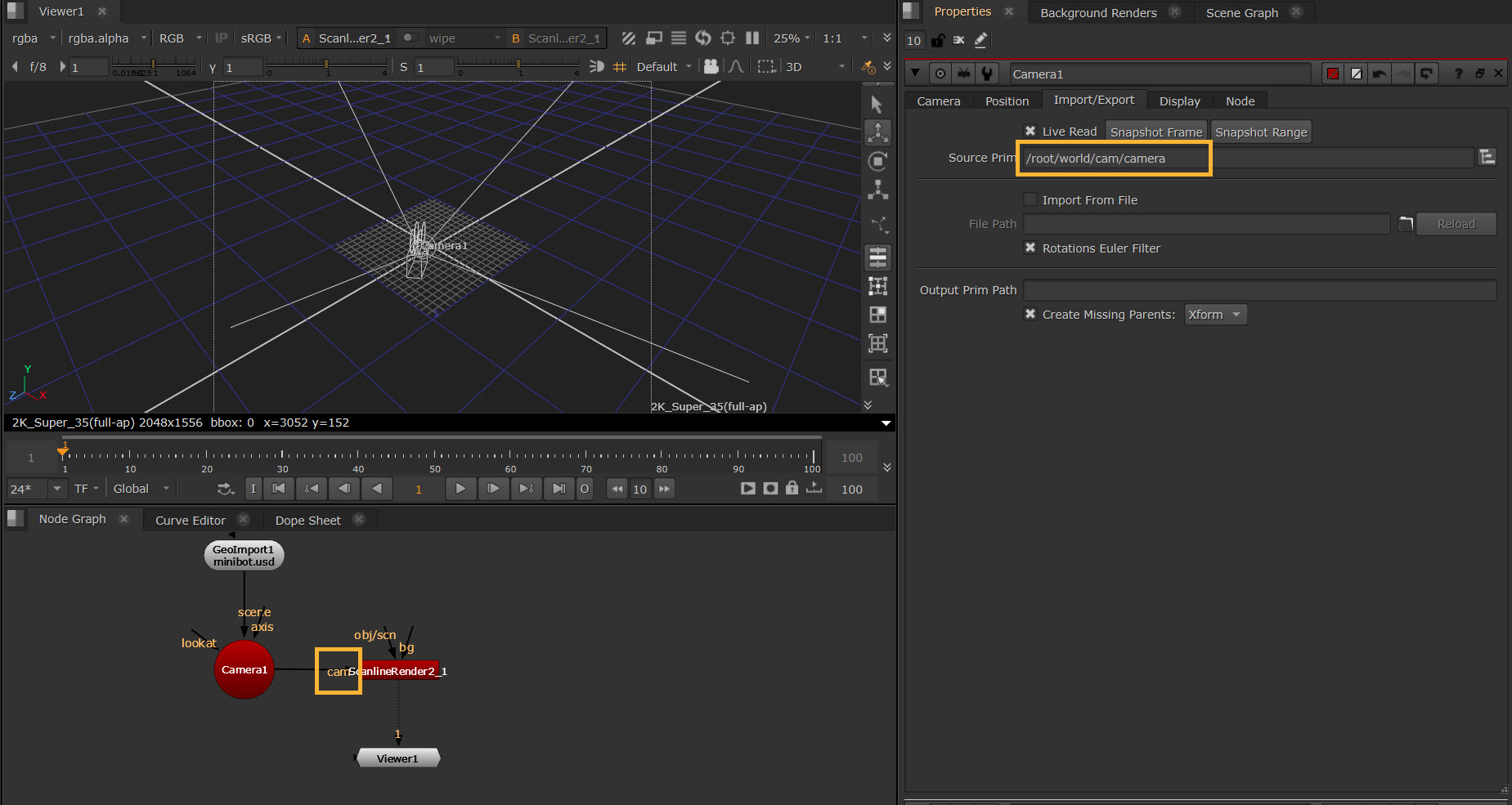 For example, here we are picking an imported USD camera from Source Prim. Bringing data into the Camera node allows you to connect that camera to any node in Nuke with a cam input, such as ScanlineRender. The camera connected to the ScanlineRender node is the camera used for rendering.