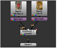 Connect the source image (the image you want to turn into another image) to the src input of the GridWarp node, and the destination image (the image you want the source image turned into) to the dst input. Connect a Viewer to the GridWarp node. |