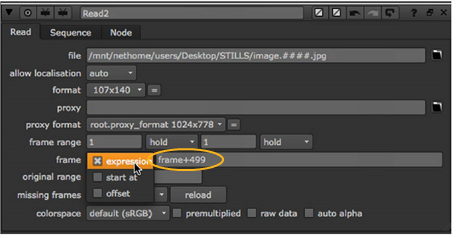 By default, Nuke assumes an exact relation between the current frame processed, and the frame read in. For example, at frame 15, Nuke reads in image.0015.rgb. However, you can change this behavior using the frame parameter on the Read node. For instance, if you have a sequence that runs from image.0500.rgb to image.1000.rgb, you may want to read in image.0500.rgb at frame 1. Nuke lets you do this using expressions, specified start frames, and constant offsets. Each method is described below.