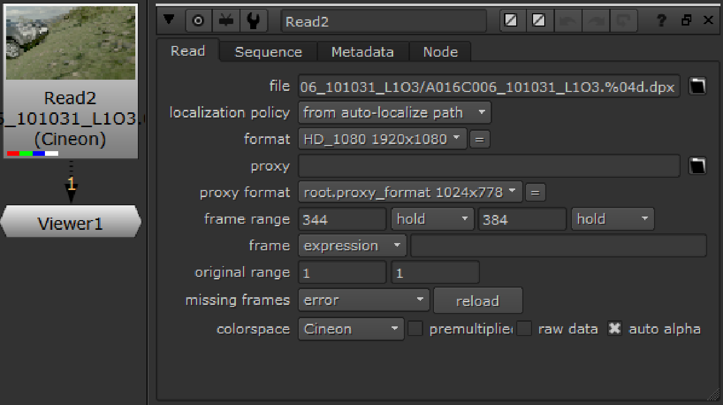 Nuke imports the image sequence and displays it as a thumbnail on the Read node. Generally, the Read node does not reformat or resize the sequence in any way, and the node’s properties panel is updated to display the native resolution and the frame range for the sequence. Note that the format and proxy format fields in the controls indicate the format of the images, they do not cause the images read from files to be resized to this format.